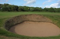The view of the 7th green from the right-hand side, showing one of three bunkers that guard the putting surface. Continue reading Hole 7