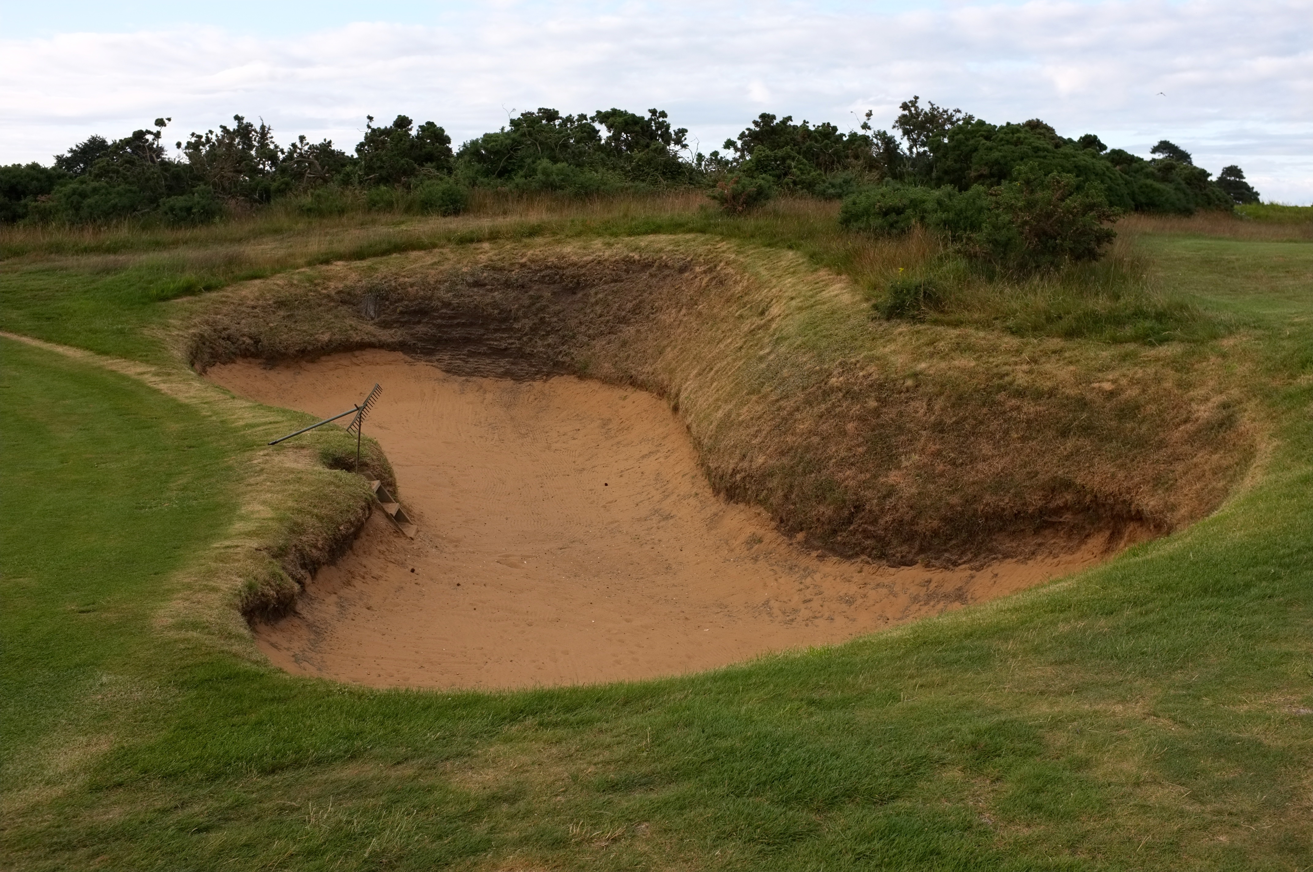 A view of the punishing fairway bunker on the left-hand side of the 14th hole, which helps protect the green from being driven at this short par four. Continue reading Hole 14