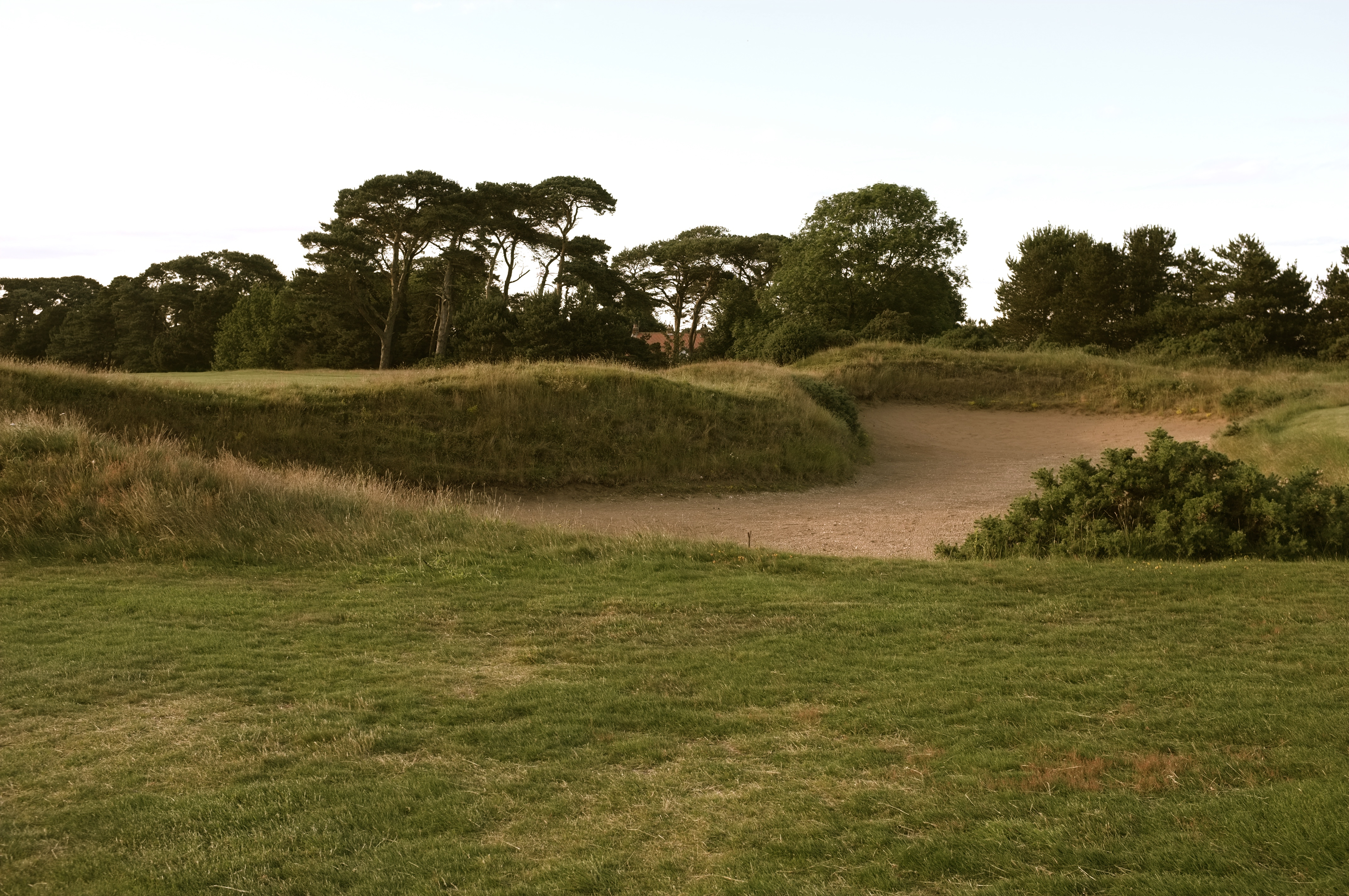 The view of the enormous cross bunker from the left-hand side. This bunker stretches the full width of the fairway and so must be carried with the tee shot. Continue reading Hole 16
